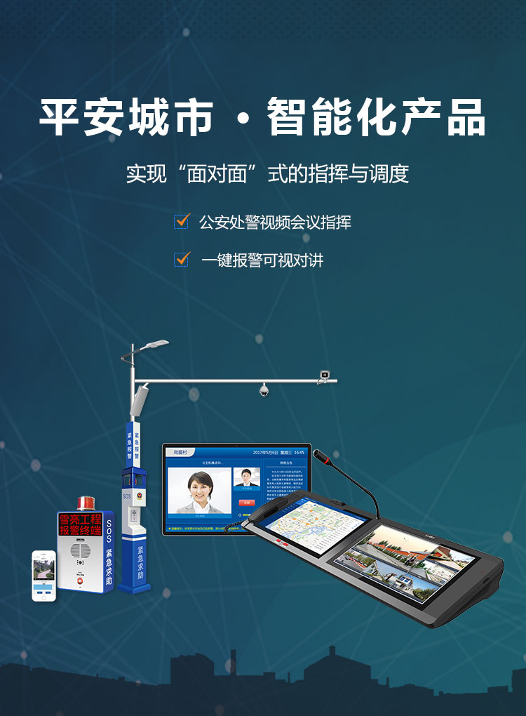 整合平安城市二大子系統,具有公安處警視頻指揮、一鍵報警可視對講,為平安城市提供可視化的一鍵報警、視頻指揮解決方案。
