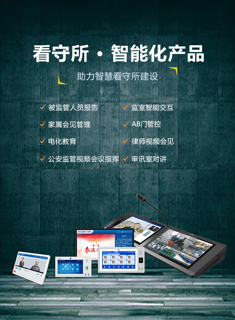 整合看守所六大子系統,具有被監管人員報告、家屬會見管理、電化教育、律師視頻會見、公安監管視頻會議指揮等,為看守所提供智能一體化解決方案。